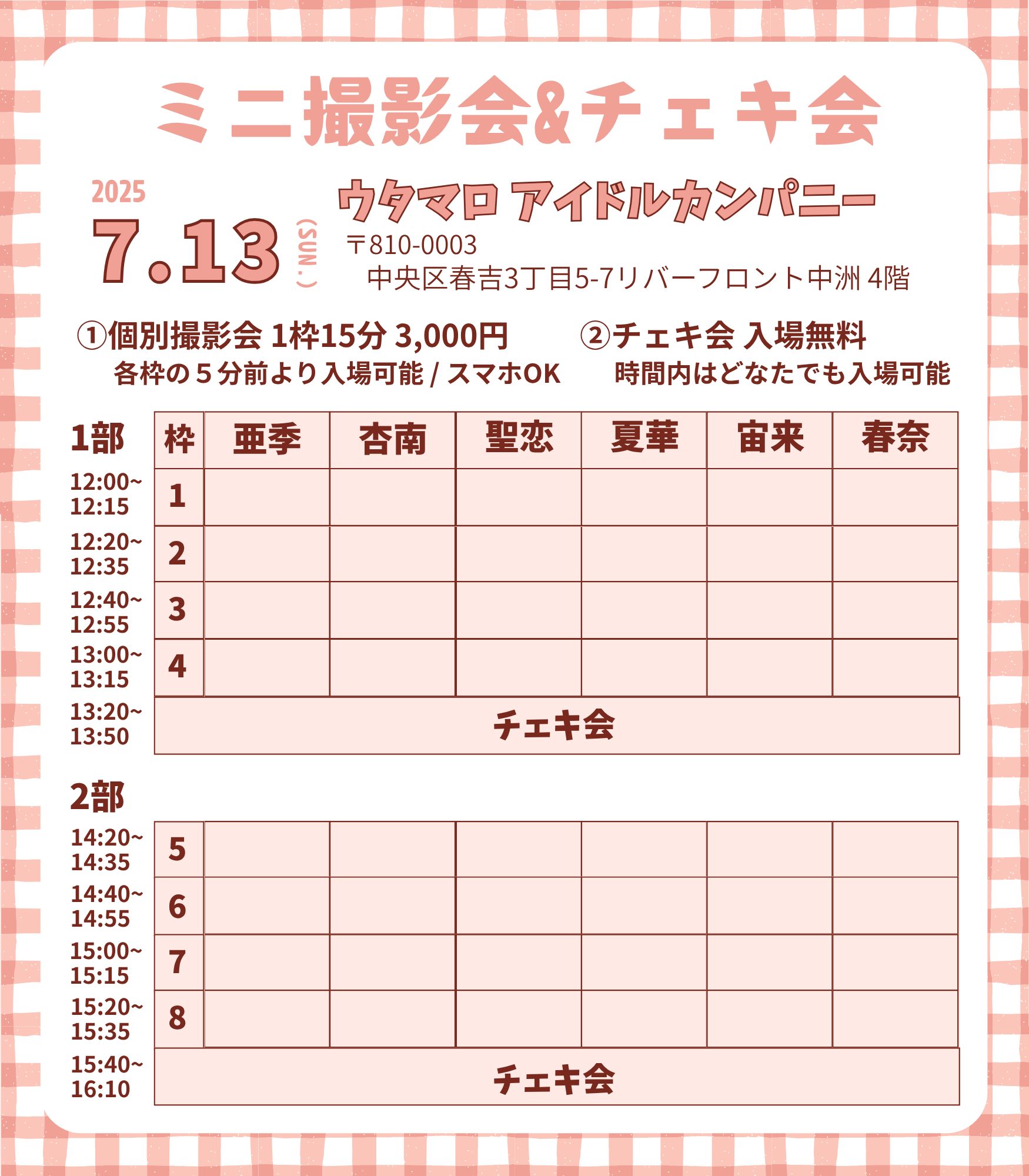 料金:撮影会 1枠15分 3,000円(1対1の個別撮影のみ) / チェキ会入場無料