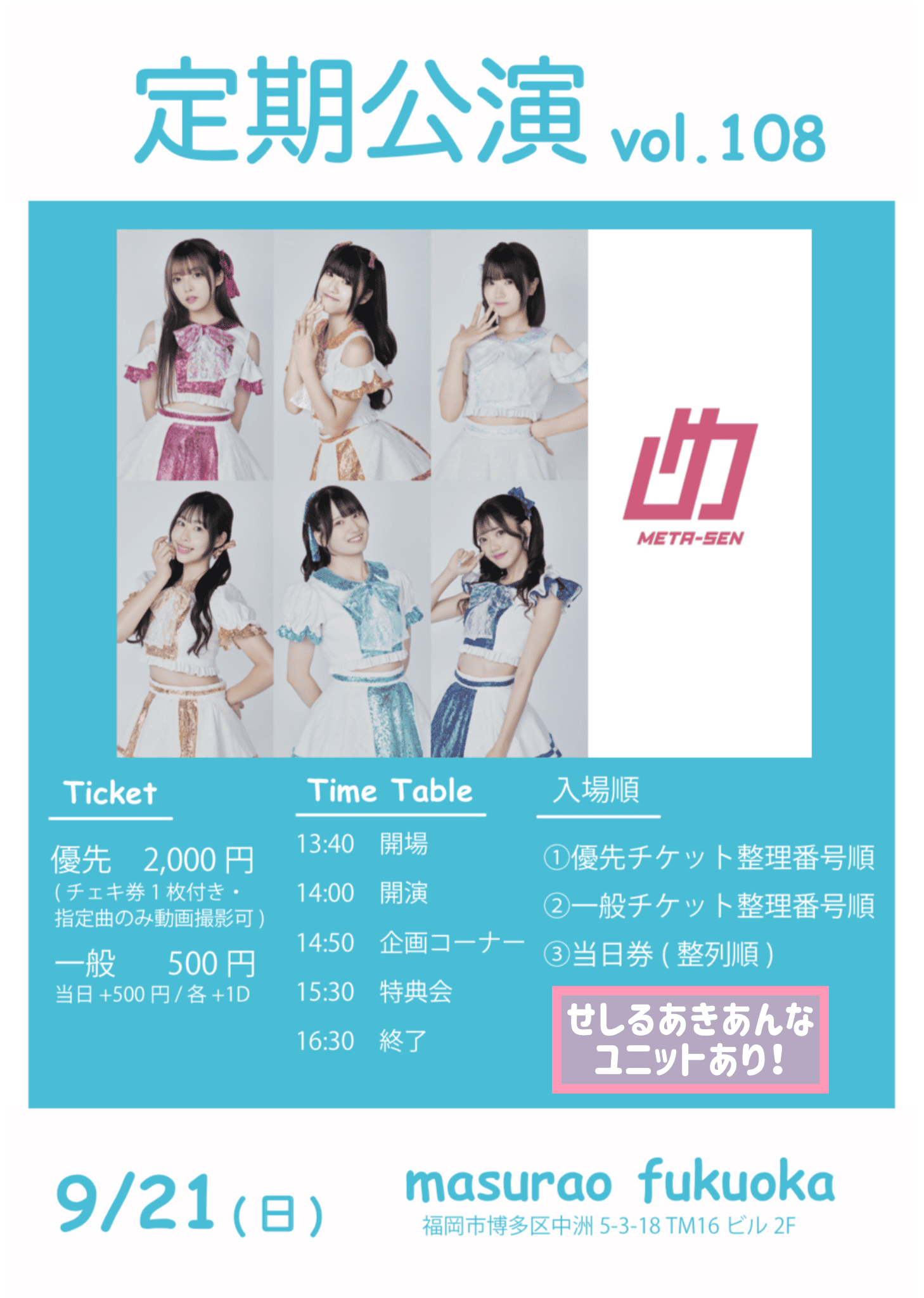 料金:優先 2,000円(チェキ券1枚付き・指定曲のみ動画撮影可)/一般 0円/当日+500円(各+1ドリンク)