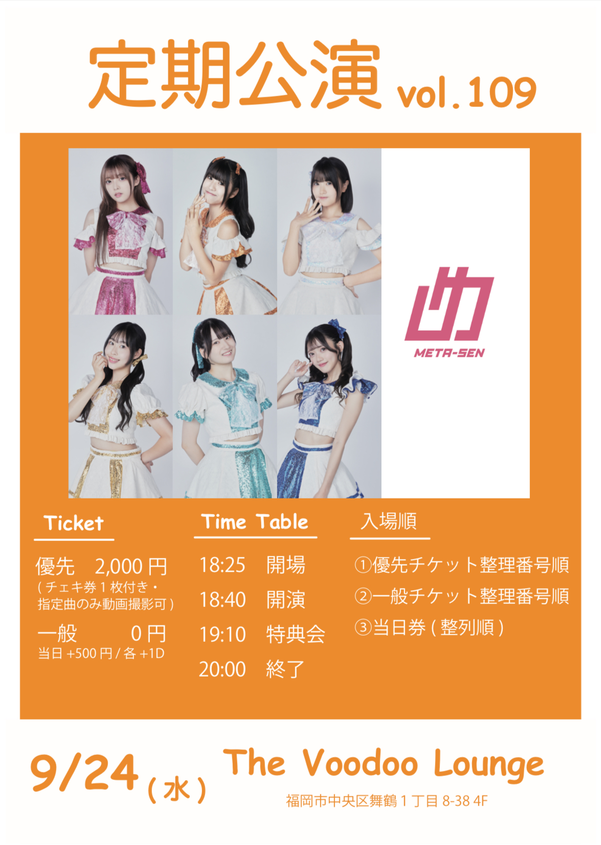 料金:優先2000円(指定曲のみ動画撮影OK、チェキ券1枚)/一般 0円/当日+500円(各+1ドリンク)