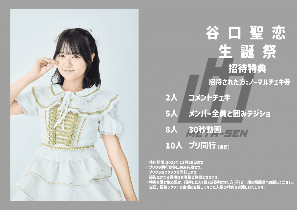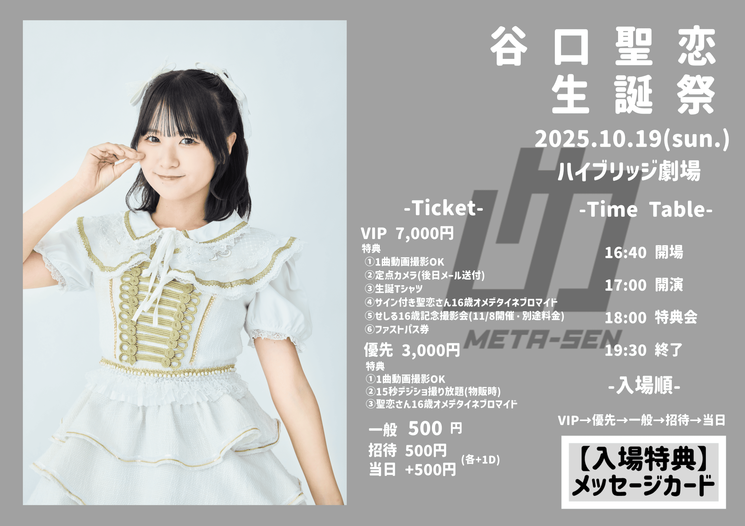 料金:VIP 7,000円(①1曲動画撮影OK②定点カメラ③生誕Tシャツ④サイン付き聖恋さん16歳オメデタイネブロマイド⑤せしる16歳記念撮影会(11/8開催・別途料金)⑥ファストパス券/優先 3,000円(①1曲動画撮影OK②15秒デジショ③聖恋さん16歳オメデタイネブロマイド)/一般 500円/招待 500円/当日 +500円(各+1D)