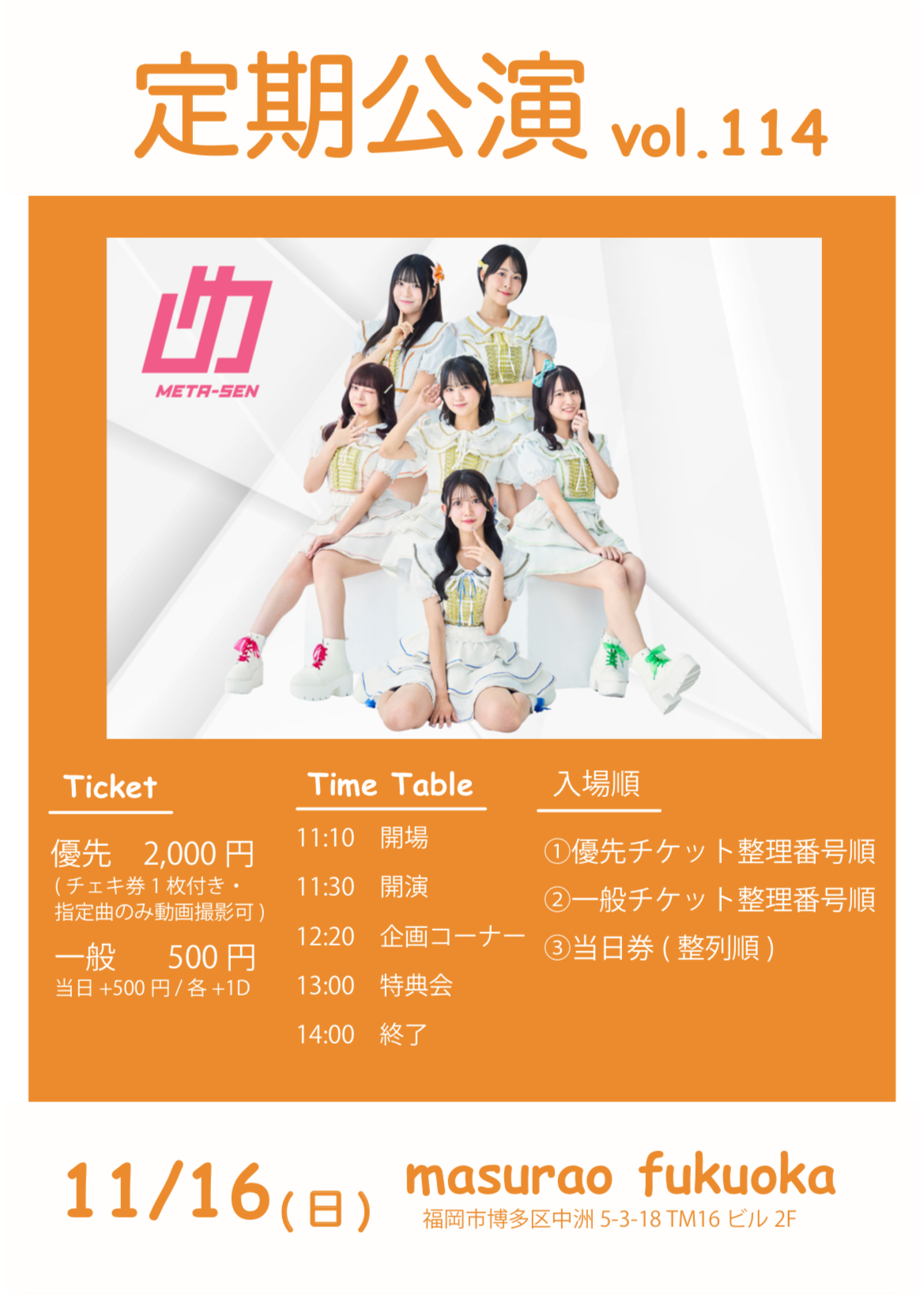 料金:優先 2,000円(チェキ券1枚付き・指定曲のみ動画撮影可)/一般 0円/当日+500円(各+1ドリンク)