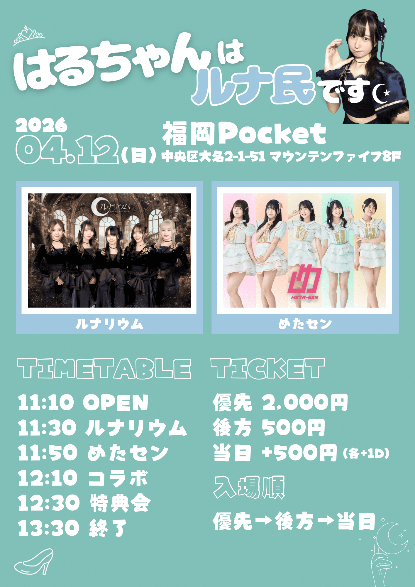 料金:前方 2,000円 / 後方 500円 / 当日 +500円(各+1ドリンク)