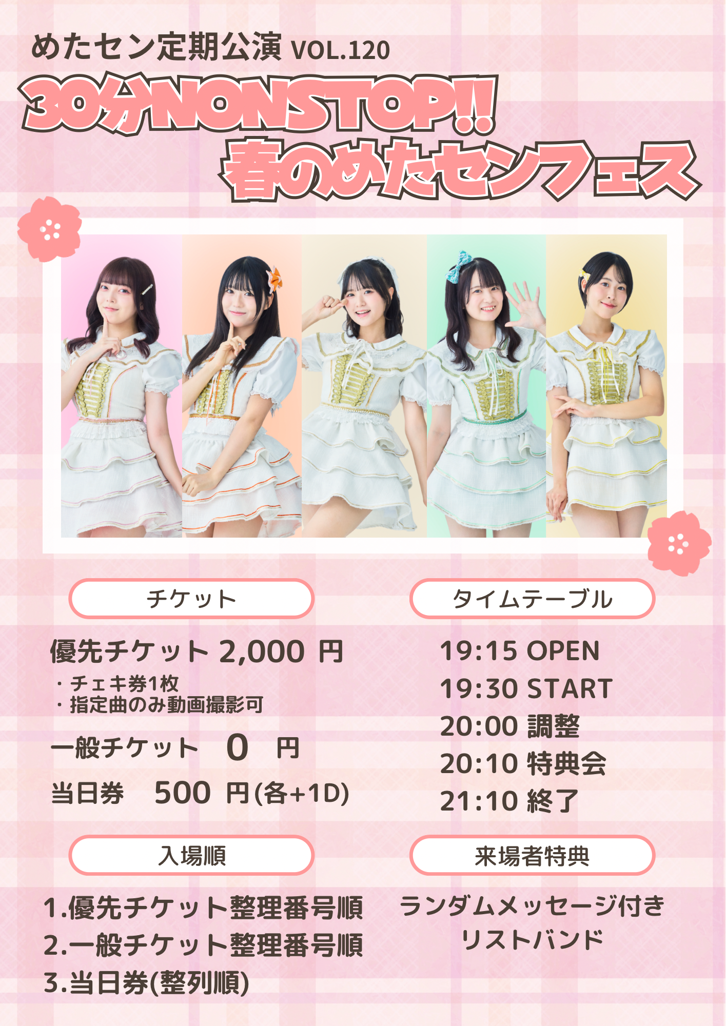 料金:優先 2,000円(指定曲のみ動画撮影OK、チェキ券1枚)/一般 0円/当日+500円(各+1ドリンク)